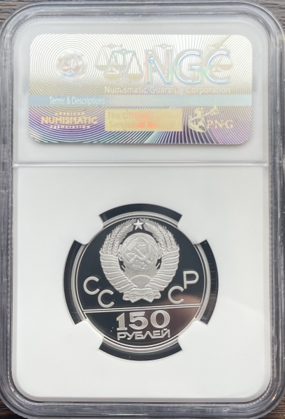 Сверху герб СССР с 15 витками ленты, слева от него буквы «СС», справа «СР», ниже двойная черта, под ней обозначение достоинства монеты цифра «150» и ниже слово «РУБЛЕЙ».